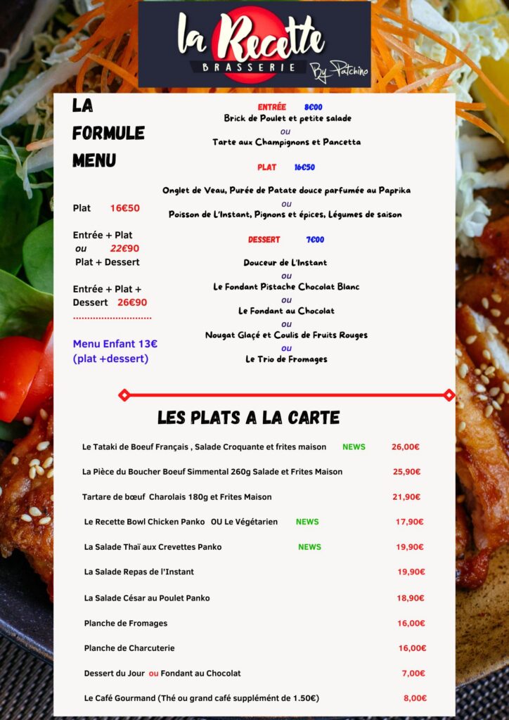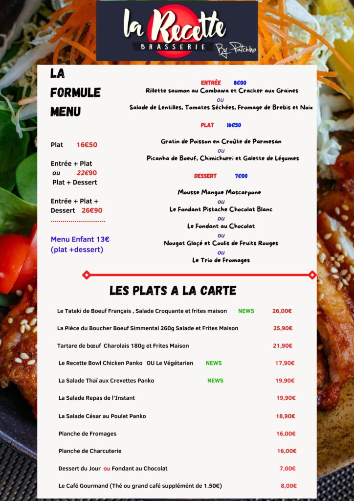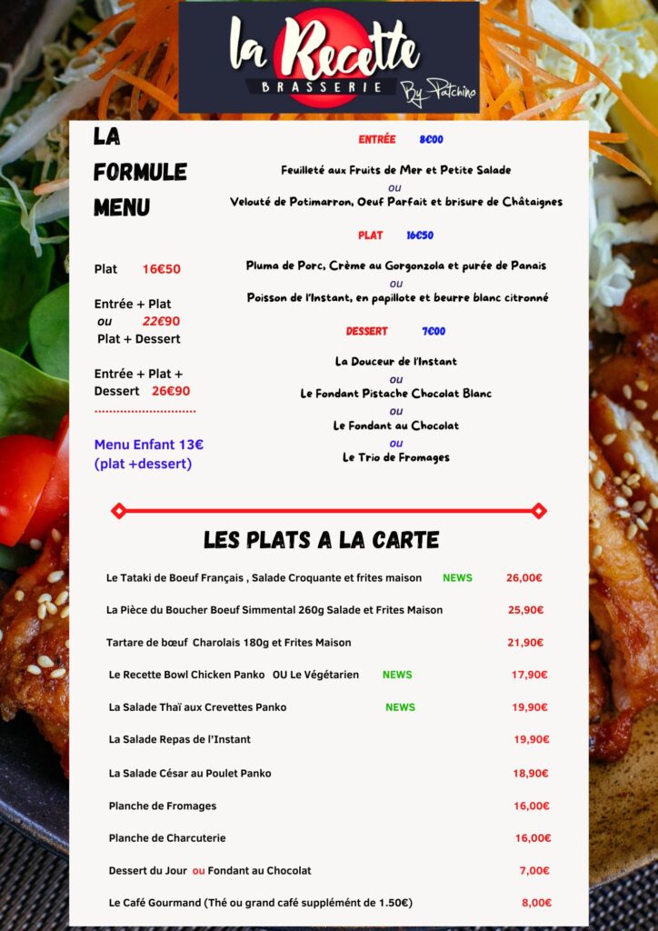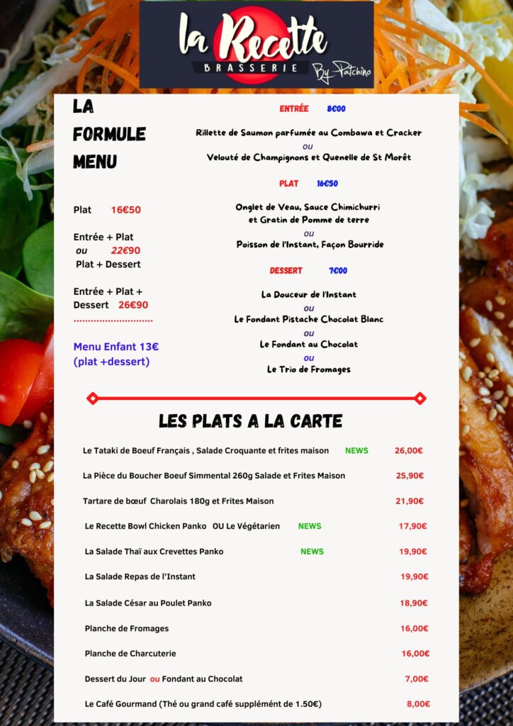 • Plat : 16€• Entrée + Plat ou Plat + Dessert : 21,90€• Entrée + Plat + Dessert : 24,90€