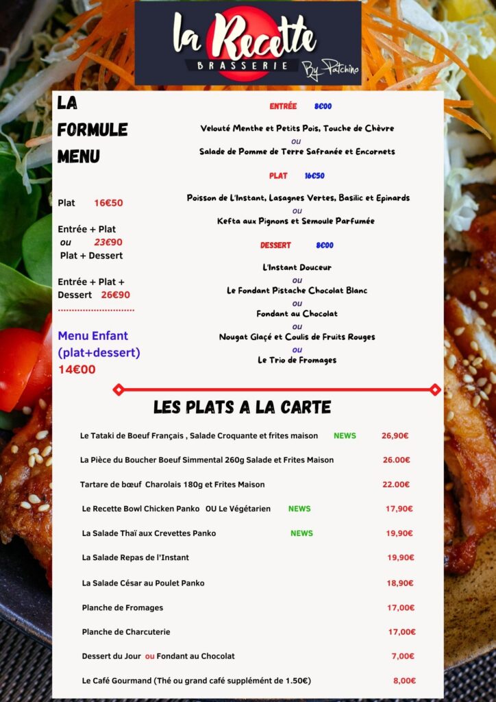 • Plat : 16,50€• Entrée + Plat ou Plat + Dessert : 23,90€• Entrée + Plat + Dessert : 26,90€